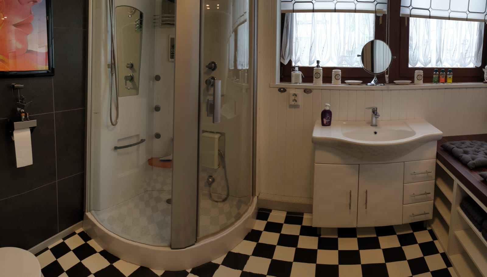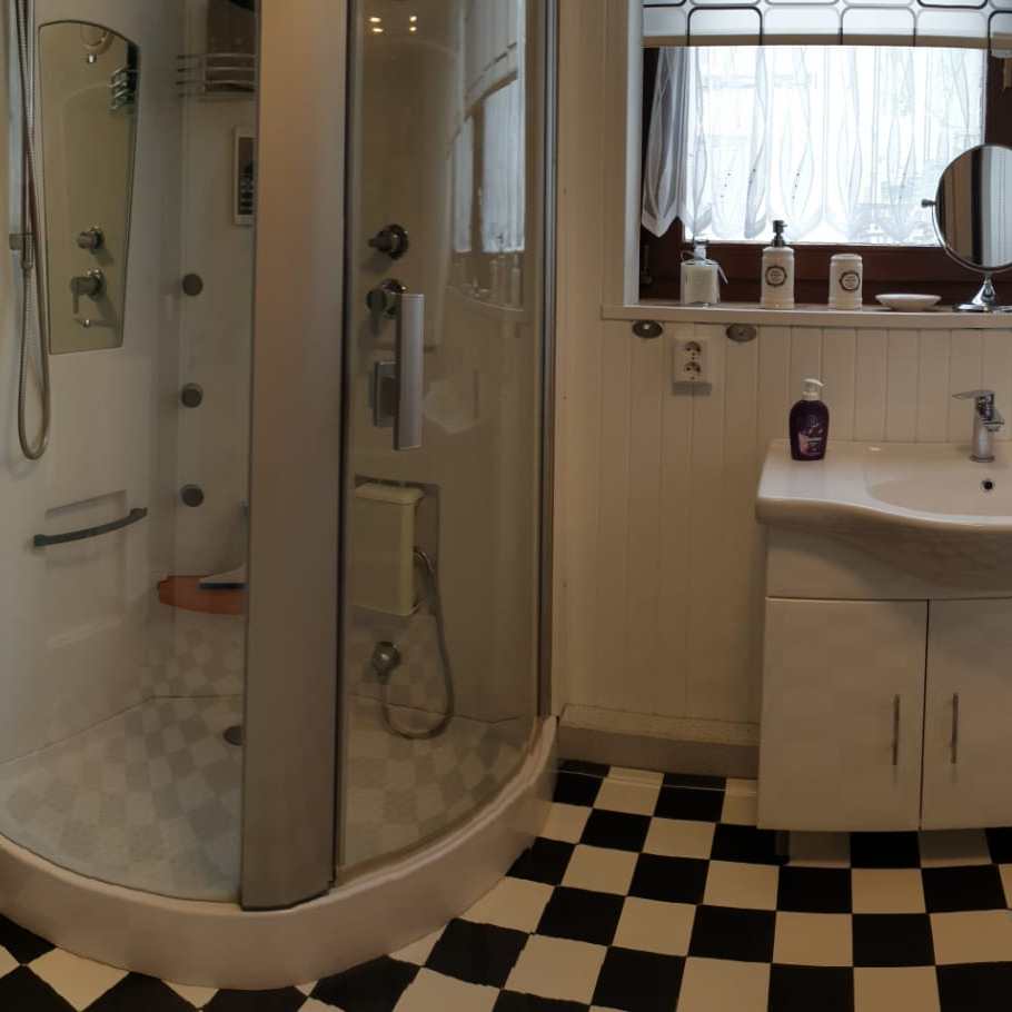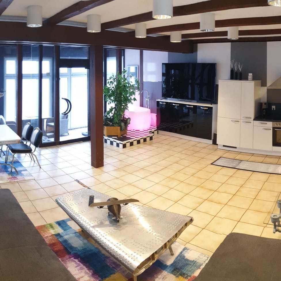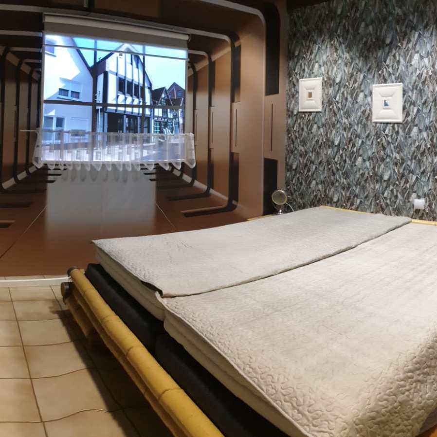 Die Fewo hat ca 80 qm, ein Schlafzimmer mit Doppelbett, ein Bad mit Dusche, Gäste-WC und ein Wohnraum mit integrierter Küche und Badewanne.